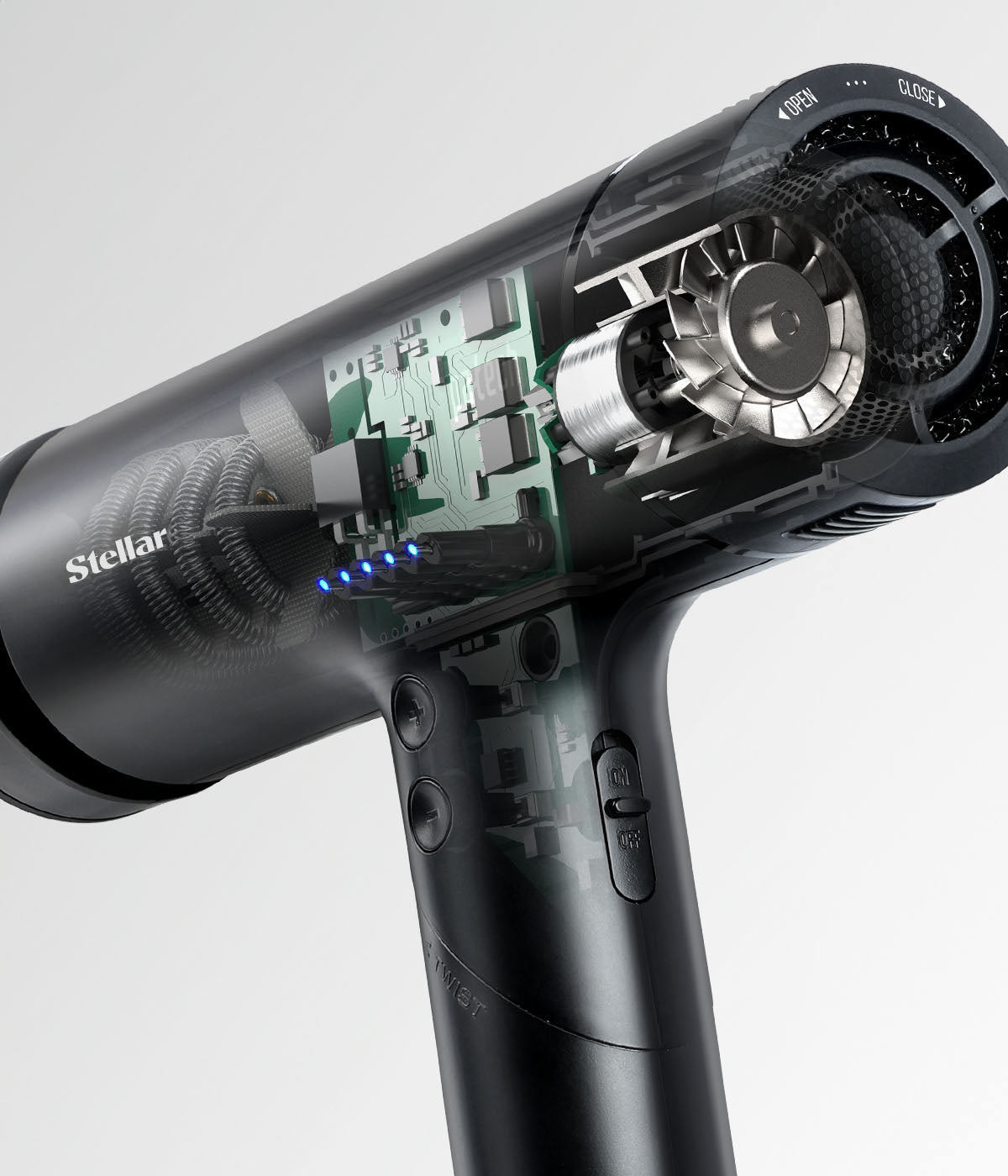 Opplev det ultimate tørkeverktøyet innen dagens hårpleieteknologi med Stellar OmniFlex®, designet for din bekvemmelighet og helse.